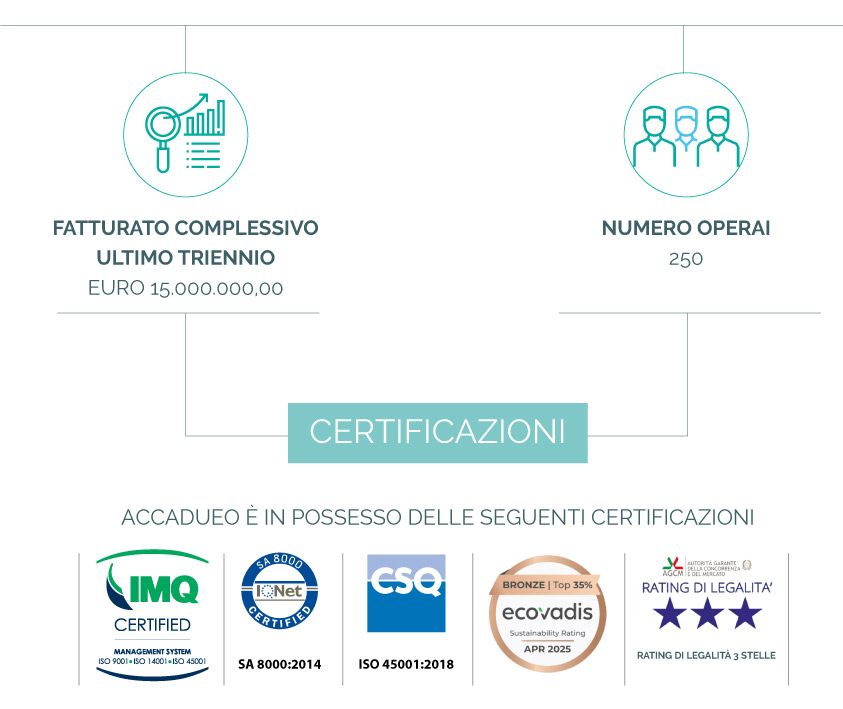 Il management di Accadueo S.r.l. persegue i principi di innovazione costante e di formazione continua, guidato da una visione imprenditoriale che si muove su più fronti: la gestione dell’impatto ambientale, con l’introduzione di metodologie green; la corrispondente formazione delle maestranze all’autocoscienza ambientale; la digitalizzazione nella gestione dei processi di monitoraggio e controllo organizzativo attraverso un software nativo (e dunque esclusivo) finanziato dalla Comunità Europea, in grado di consentire la condivisione delle informazioni al committente. Tale visione ha permesso alla società di raggiungere livelli di capacità tecnica, equilibrio ambientale e qualità organizzativa singolari per efficacia, operando per gruppi nazionali della Sanità pubblica – per enti pubblici di primaria importanza e privata.